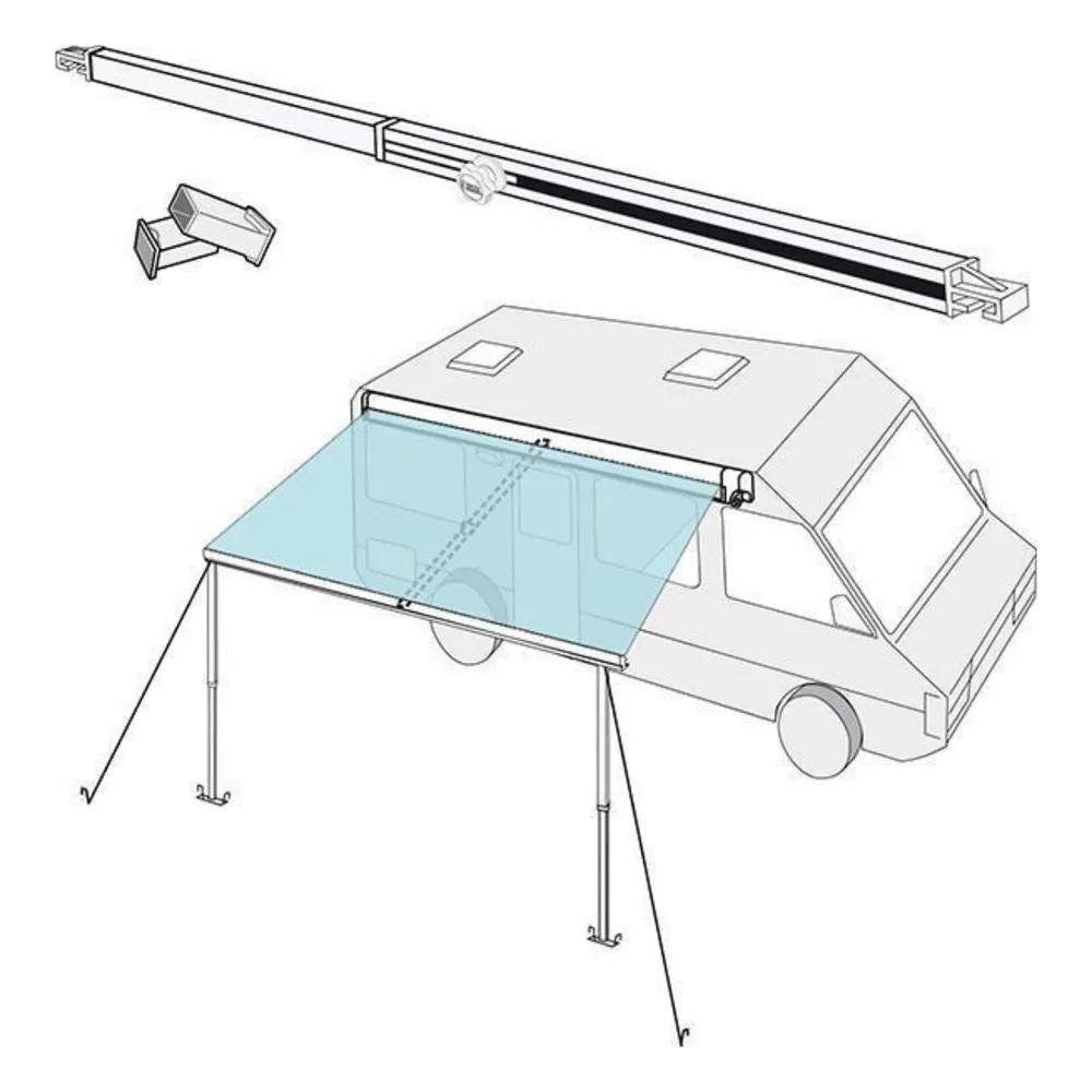 The straight Fiamma Rafter Suits All Fiamma Awning Models including the F45, F80, and F65. The anodized aluminum tension rafter is supplied with 2 securing wall clips for storage inside the vehicle.