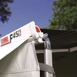 The Fiamma F45 S 260 Awning in Polar White Case with Royal Grey Fabric is a high-quality, easy-to-use retractable awning designed for campervans, motorhomes, and RVs. Featuring a sleek powder-coated metal case, it extends effortlessly with a detachable winder and has telescopic legs for stability.