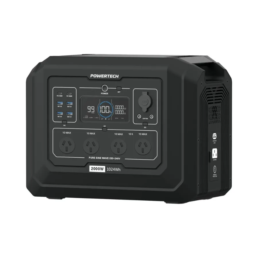 The Powertech S1 portable power station is equipped with a medium sized 1024Wh capacity battery, 2000W power output, and various outlets to support multiple devices via mains, DC & cigarette sockets, USB-A & USB-C sockets and even an expandable battery output. Comes with advanced features, such as fast charging and advanced battery management.