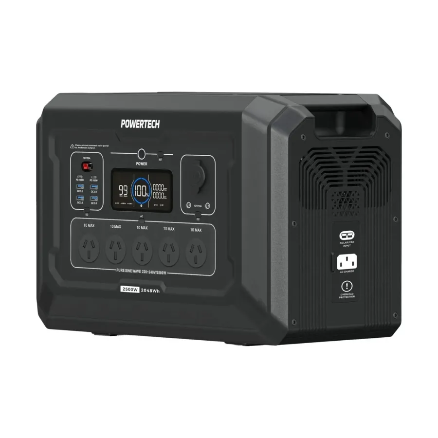 The Powertech S2 portable power station is equipped with a medium sized 2048Wh capacity battery, 2500W power output, and various outlets to support multiple devices via mains, DC & cigarette sockets, USB-A & USB-C sockets and even an expandable battery output. Comes with advanced features, such as fast charging, a UPS function, and advanced battery management.