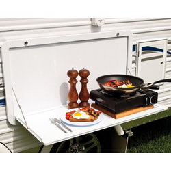 The Lifestyletable is a low profile folding table that is easily attached to the side of your caravan, without cutting a large hole into your exterior wall. Australian designed and manufactured with quality stainless steel, aluminium extrusion and injection moulded nylon corners. The sturdy construction allows for a maximum weight allowance of 25kg.