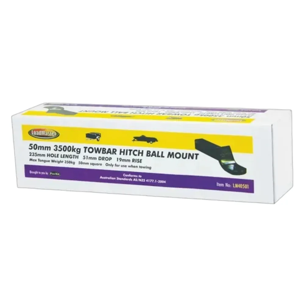The LoadMaster 50mm Towbar Hitch Ball Mount is ideal for towing recreational RV's including Caravans, Pop Tops, Camper Trailers, Horse Floats & Boat Trailers. Made to conform with Australian Standard AS 4177.1-2004, this is a quaility product made to last.