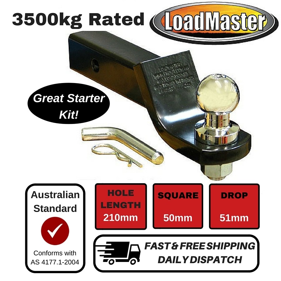 The LoadMaster 50mm Towbar, Tow Ball & Hitch Pin Kit has everything you need to get towning. It is ideal for towing recreational RV's including Caravans, Pop Tops, Camper Trailers, Horse Floats & Boat Trailers. Made to conform with Australian Standard AS 4177.1-2004, this is a quaility product made to last.