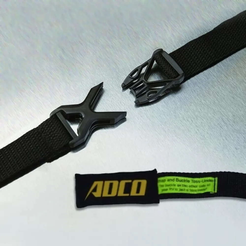 - Weighted buckle toss under allows you to easily toss the installation straps under your RV to connect to the opposite side