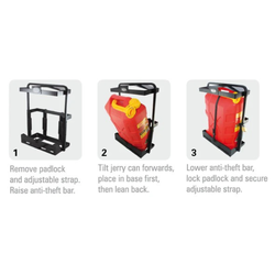 Carries and secures jerry cans up to 355mm(w) x 195mm(d) x 510mm(h)