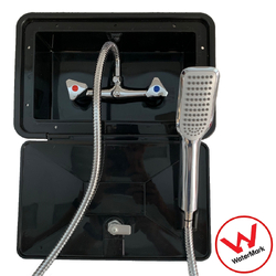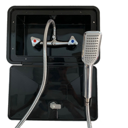 Suitable for fitting on Caravans, Motorhomes and Camper Trailers, this quality RV shower box comes with premium brass and chrome tapware with a stylish shower head. The Exterior Shower Box can be mounted on the external wall of your caravan, motorhome, 5th wheel or campervan and provides constant hot or cold running water where ever you happen to be.