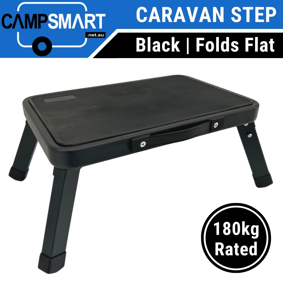 Sturdy and compact this powder-coated steel step has folding legs for easy storage. The step includes an integrated polypropylene ridged tread. Ideal for the caravan, camper trailer or motorhome but equally useful around the home.