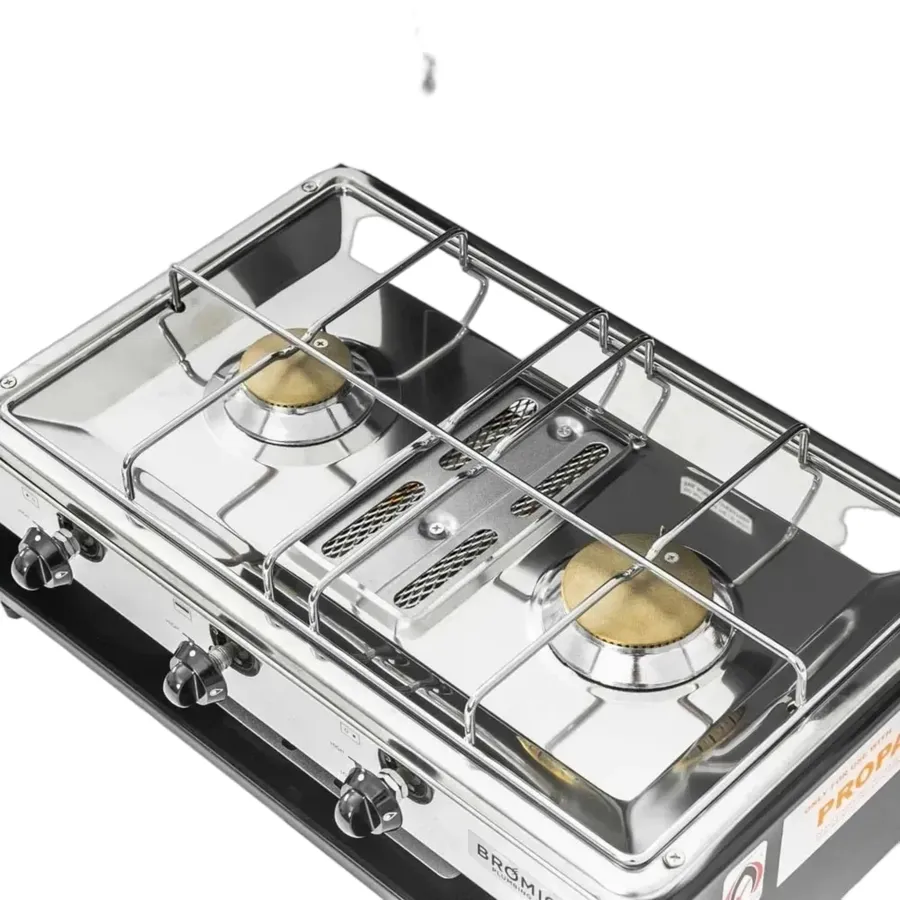The Camper Lido Junior Deluxe 2-Burner with Grill is a sturdy and compact cooker with grill, specifically designed for indoor or outdoor use in caravans, recreational vehicles and weekenders. This LPG deluxe camp cooker is a low-pressure cooker that is also suitable for use indoors, such as in Caravans, Camper Trailers and Motorhomes.