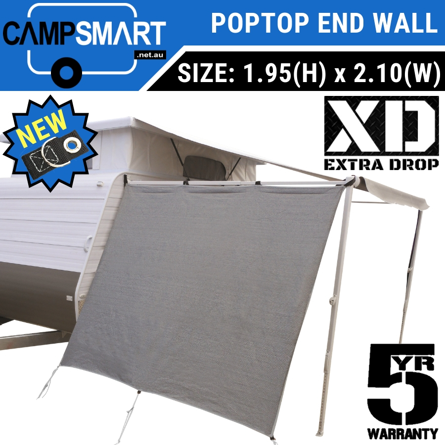 The Campsmart XD Poptop End Walls feature a 1950mm Extra Drop, matching the Height of the recently released XD Long Wall Privacy Screens. The additional 150mm drop allows for the full length screen to be pegged directly to the ground on touring RVs and is also better suits taller Off-Road models in comparison to the standard 1800mm drop.