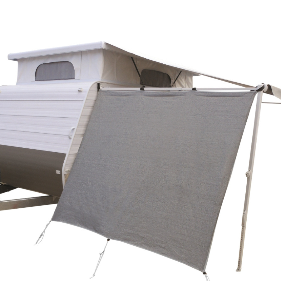 The extra drop Pop Top end wall privacy screens also feature 6mm keder rope (in addition to velcro straps) for attachment. This provides for additional flexibility with the screen. You can slide it into an Anti Flap Kit (where fitted) & use with poles as a front porch shade extension, slide it into the awning track to use as a smaller long wall screen or utlise on the off side of the RV as a large kitchen / fridge screen. Two screens together on a corner can make a nice shaded nook without blocking out the whole area under the awning.