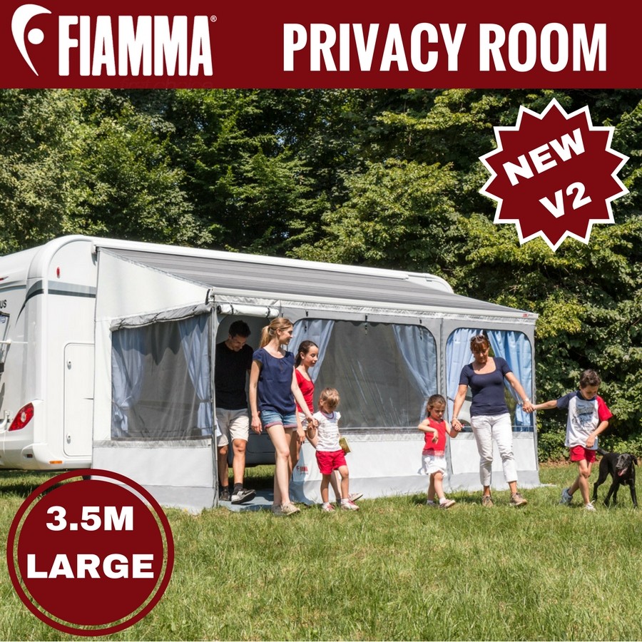 Double your outdoor living space today with one of Fiamma’s Privacy Rooms. The new version features an improved design with larger flyscreen windows, rounded window frame design and walls with a 2 tone grey modern finish. The 350 Fiamma Privacy Rooms are now a modular system that incorporates the Large 300 plus the Panel 50 to create the 350 & 3.5m width required.