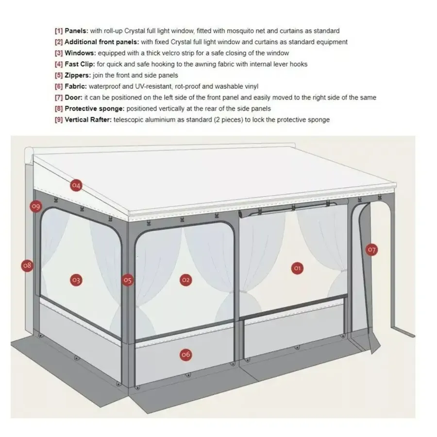 - All Crystal full light windows that can be rolled up, with mosquito net and curtains as standard