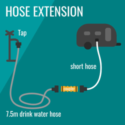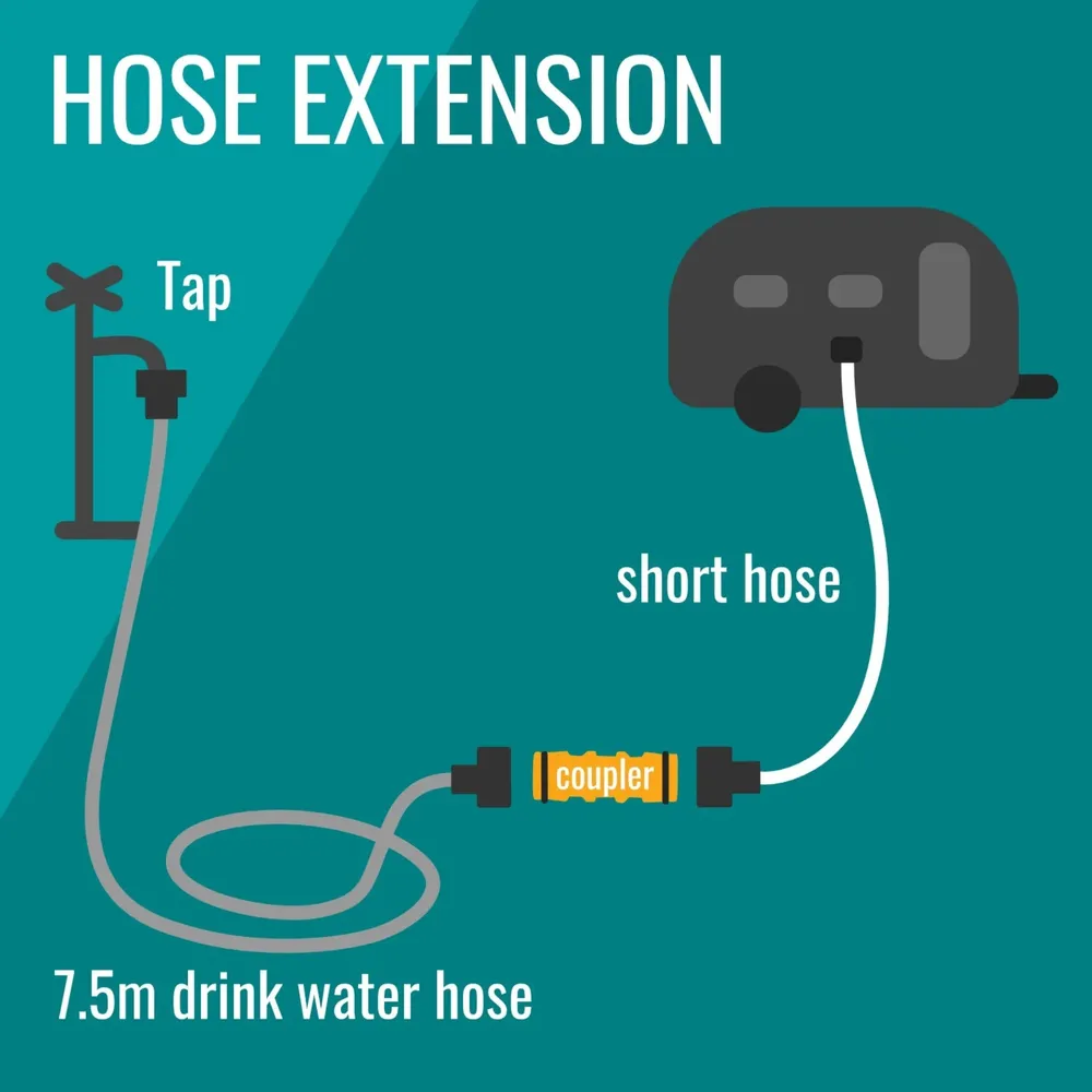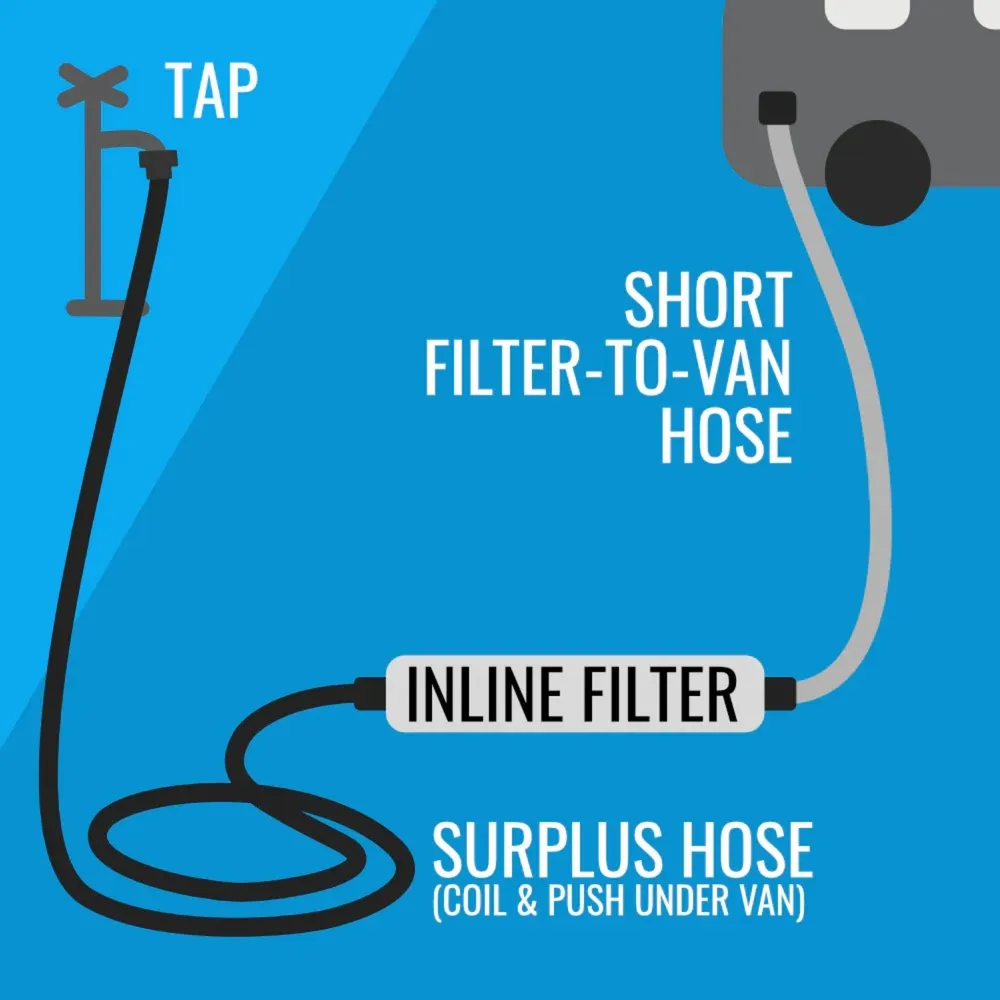If you use an external water filter (highly recommended), your long hose goes from the tap to the filter, and this short hose is used to connect the filter to your caravan/motorhome water inlet. Each option also acts as a space-saving, drip-free storage method for your filter while in transit (see the third product image), and assists with easy back-flushing of the filter after use.