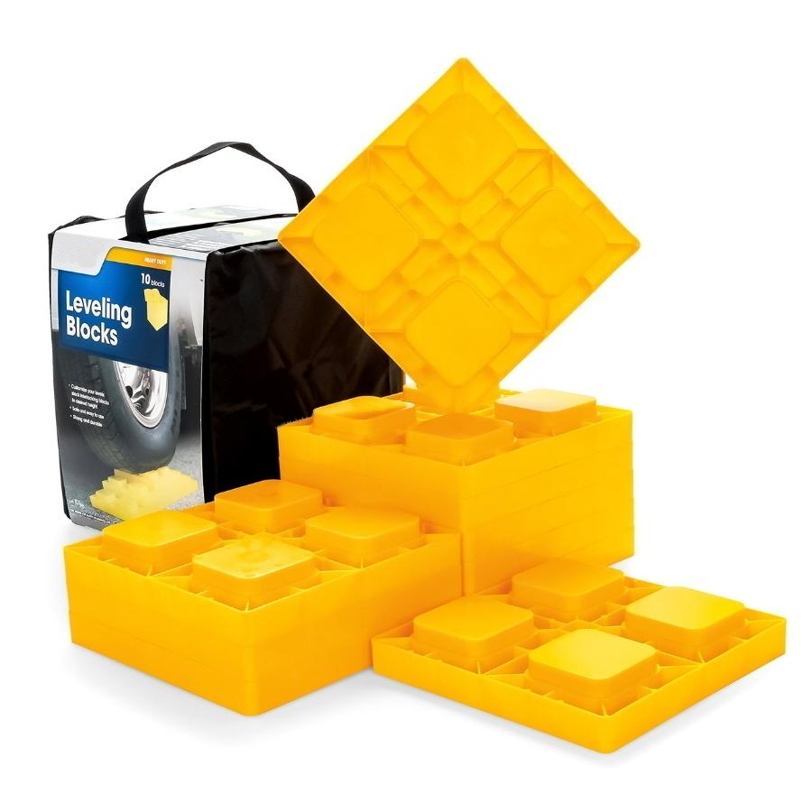 This Leveling Block 10-pack allows you to stack the interlocking blocks to the desired height for safe and easy leveling. The blocks can be used with single axle RVs such as Camper Trailers, dual axle Caravans, can be used as jack pads, with hydraulic jacks, jockey wheels and stabilizer jacks.