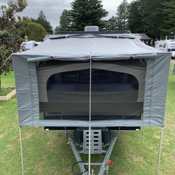 Designed to suit most brands of wind-up style Camper Trailer (including the popular Jayco range), this Bed End Fly include waterproof side panels with windows, flyscreen & zip down covers, ensuring the canvas bed ends on your camper will stay dry in wet weather. In good weather, the waterproof window covers can be rolled up, allowing ventilation & views through the flyscreen windows on each side.