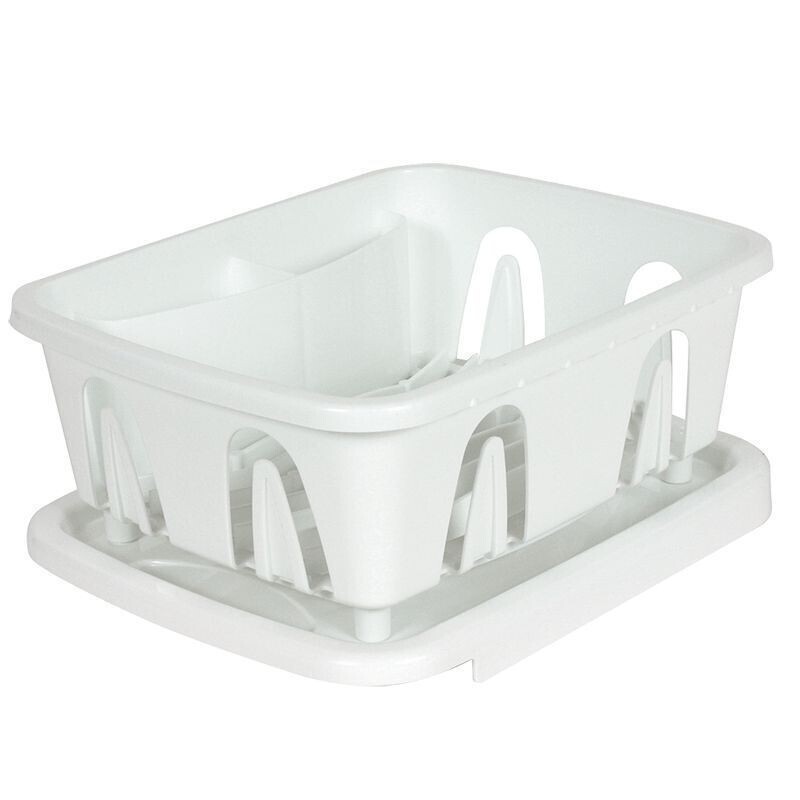 The Camco dish drainer is a great solution. It fits in most RV sinks for storage and is just the right size for limited counter space. It comes with its own slopped drainage tray and is made from durable heavy duty plastic.