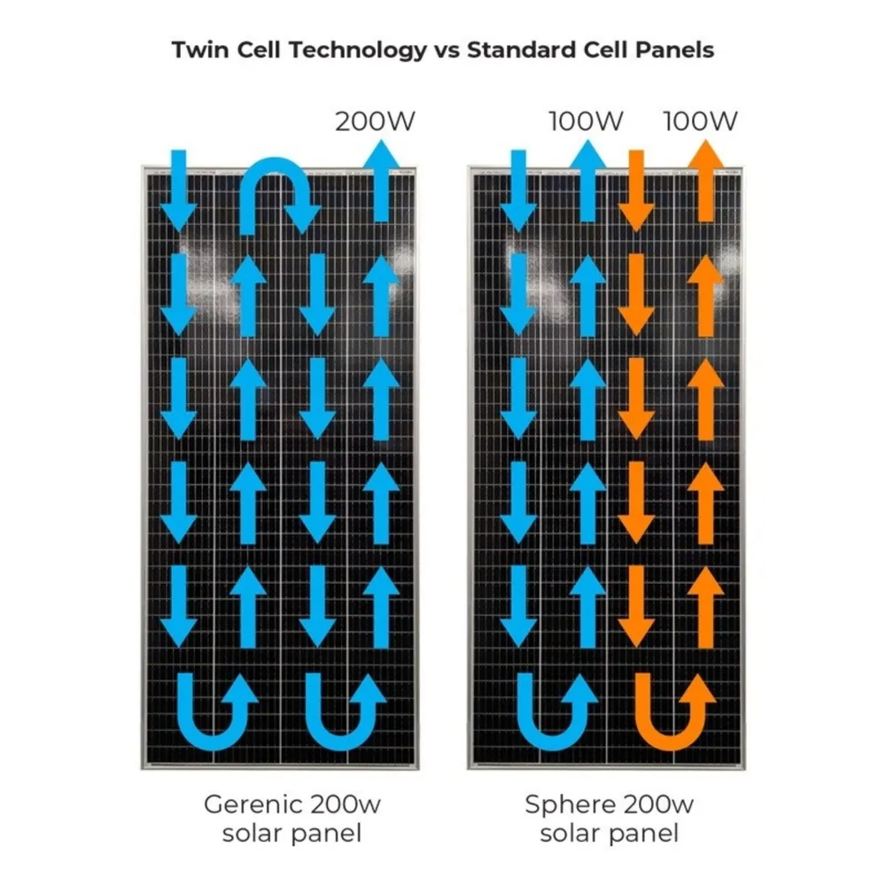 Sphere Twin Cell Technology helps reduce the impact of partial shading by allowing a single large solar panel to operate as if it were two smaller panels with isolated circuit paths. This unique parallel design allows each side of the panel to function independently from the other. When one half of a panel is covered by shade, the other will still perform at full capacity. Where partial shading will have already stopped traditional mono-crystalline panels from providing vital power, Sphere Solar Panels with Twin Cell Technology will keep on charging.