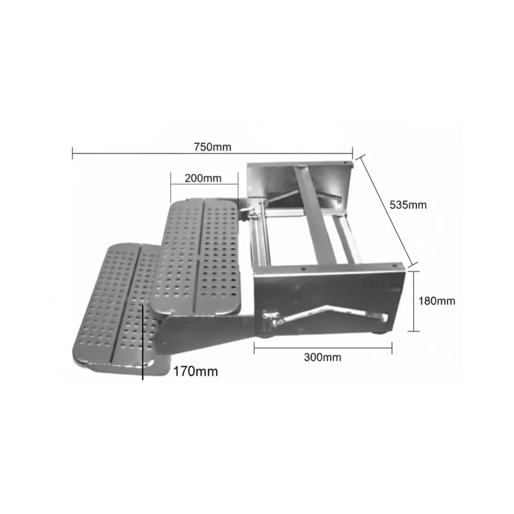 Suitable for Caravans, Motorhomes and Camper Trailers, the double pull out step slides back into it's own cavity for travelling. It's a fixed step to be welded or bolted onto the RV with the additional step providing easier access with reduced drop to the ground, compared to single pull out steps.