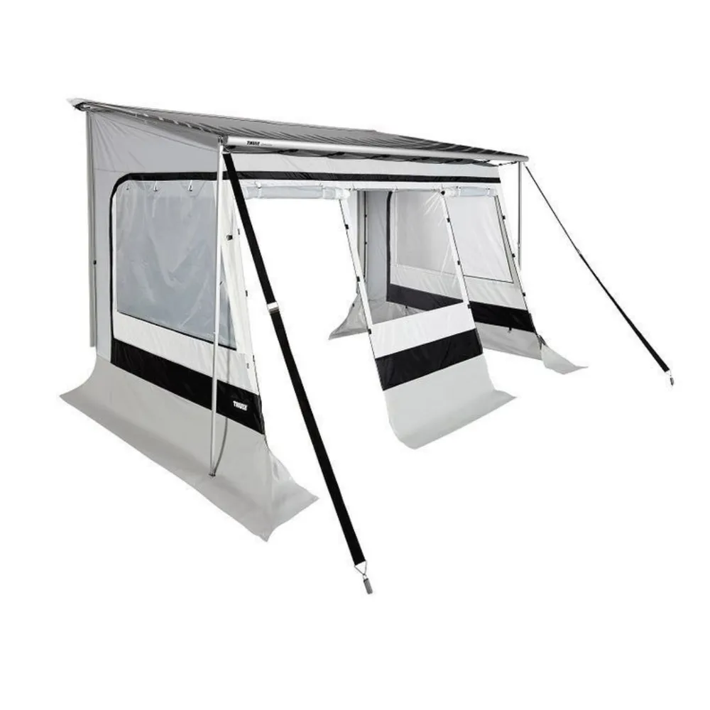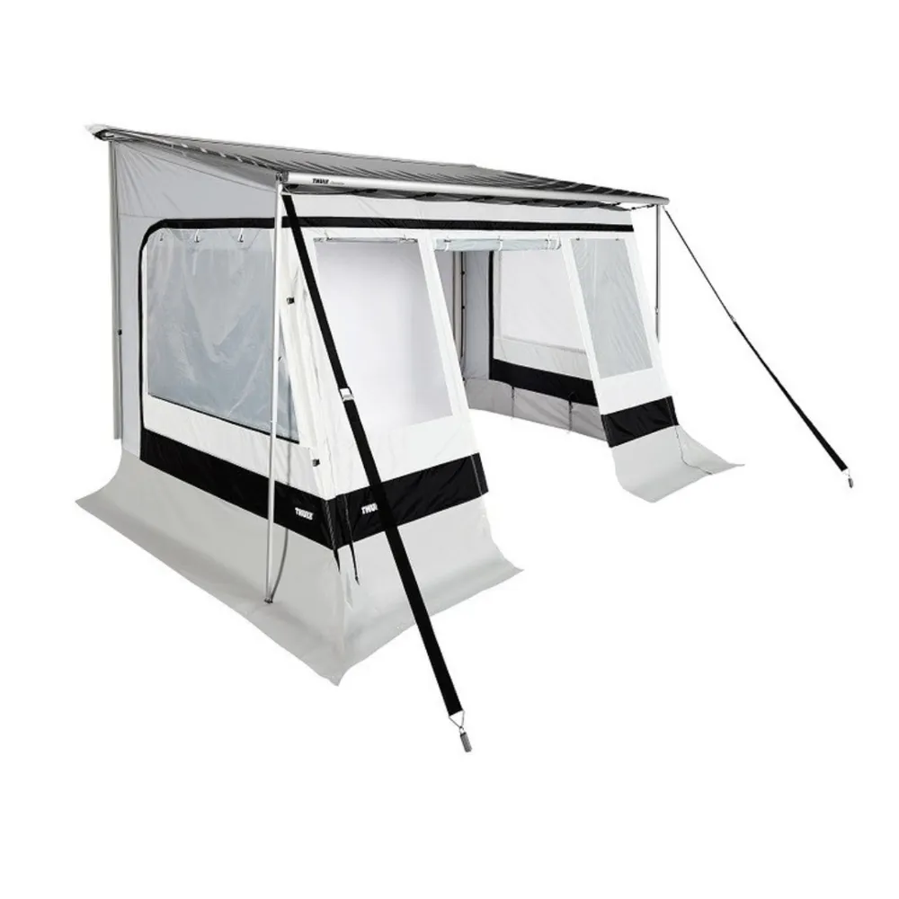 The Thule EasyLink light weight annexe is easy and fast to install, fits into a compact carry bag and includes a unique double roof design for better insulation. It also features a sloping front wall to increase your living space and includes 3 integrated front windows / doors offering a versatile set-up.
