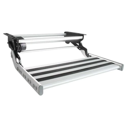 A single 12-volt electric current powers the electric caravan step with LED light and features a built-in LED light to improve visibility in low-light conditions. This type of step is usually operated by a switch located inside the door and is mounted to the exterior of the vehicle. When not in use, the step can be retracted to remain flush with the vehicle’s body, helping to reduce wind resistance and improve fuel efficiency while driving.