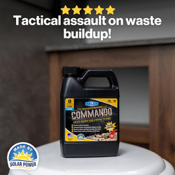 Empty black holding tank and close valve. Add 4oz of Commando liquid into the empty tank and fill the holding tank full of water. The water level needs to cover all sensors to allow Commando to penetrate and clean any buildup off he walls and sensors. Let product sit in tank for 12 to 24 hours. Driving the vehicle to agitate can help speed up the process, but is not required. 12 hours is sufficient to break down most waste and paper buildup, but extreme cases may require letting the tank sit for 24 hours. One 4oz dose of Commando liquid will treat a holding tank capacity up to 50 gallons.