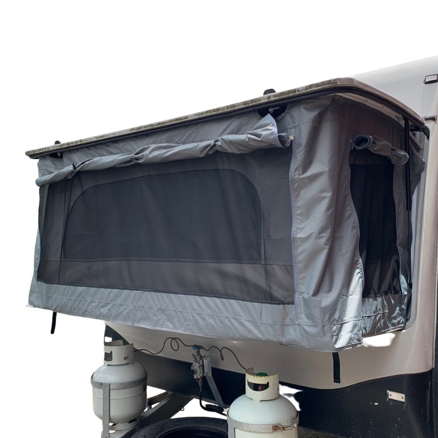 This waterproof bed end fly storm cover provides all-weather protection for your front fold-out bed end, keeping the canvas and bedding dry on rainy days. This version also includes 3 zip down windows (1 on each side) with fly screen.