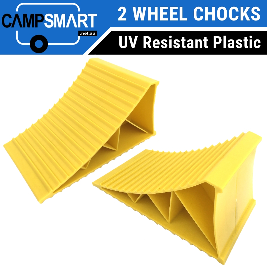 Solidly constructed of durable hard plastic with UV inhibitors, these yellow wheel chocks are ideal for caravans, motorhomes, Camper Trailers, Box Trailers and Boats.