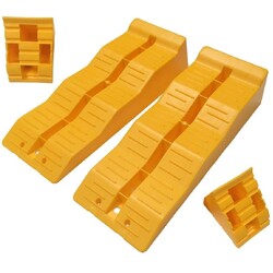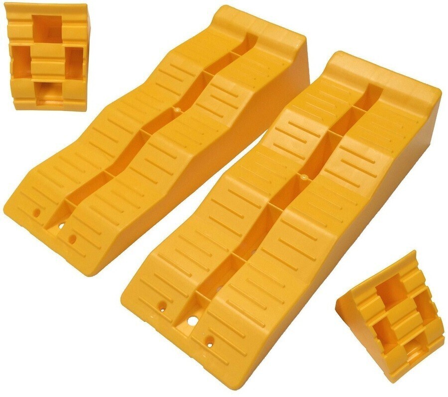 This pair of levelling ramps features 3 level heights with a ridged surface to grip to the tires. The levels are lightweight and made from rust-proof material also easy to clean and UV-resistant. Also included in the kit are a pair of matching chocks.